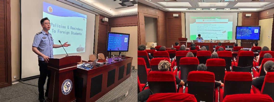 随后,一系列丰富实用的教育活动接连展开。9月12日,邀请浦东公安分局出入境管理支队徐巍警官、浦东公安分局张江高校派出所葛轩齐警官以及校保卫处副处长尤西虎面向全体留学生新生开展普法教育专题讲座。讲座聚焦法规政策、禁毒防骗、校园安全等关键领域,通过生动讲解与案例分析,有效增强了新生的法律意识与安全防范能力。